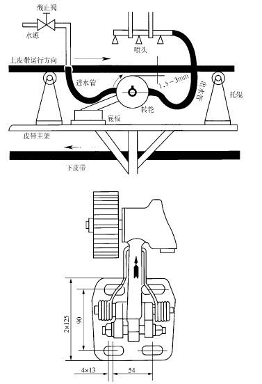 自控式喷雾装置转轮靠与皮带摩擦力带动。转轮转动时带动自动式喷雾装置内部的液压自动操作系统打开给水阀,停止转动后自动关闭自控喷雾装置的给水阀。该装置在安装后能通过偏心轮来调整高低,调整量在±25mm左右,以确保其理想的安装高度。